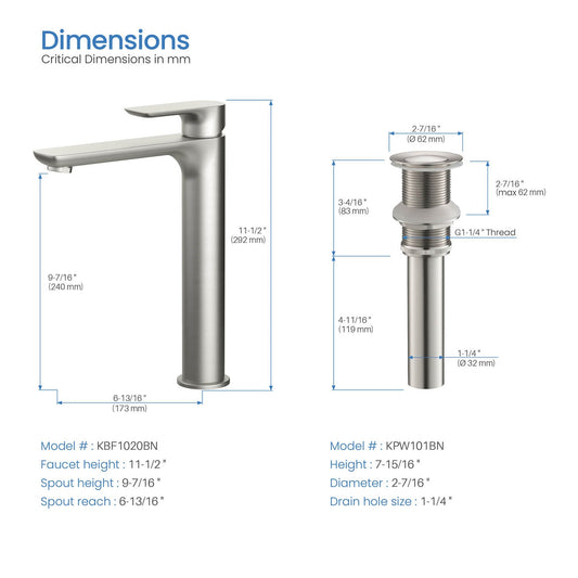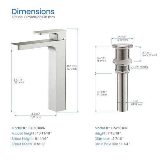 KIBI Blaze-T Single Handle Brushed Nickel Solid Brass Bathroom Vessel Sink Faucet With Pop-Up Drain Stopper Small Cover Without Overflow