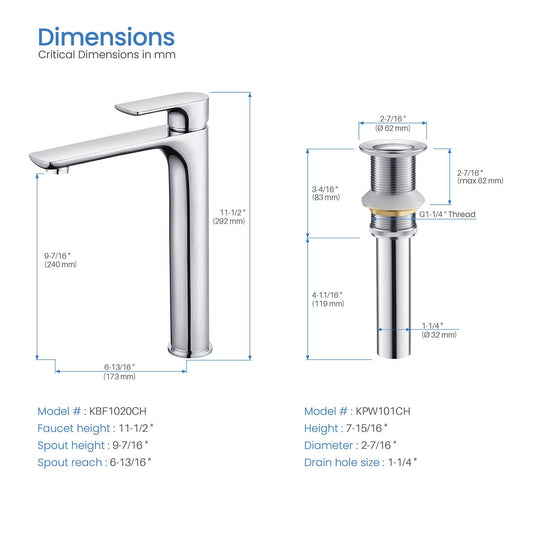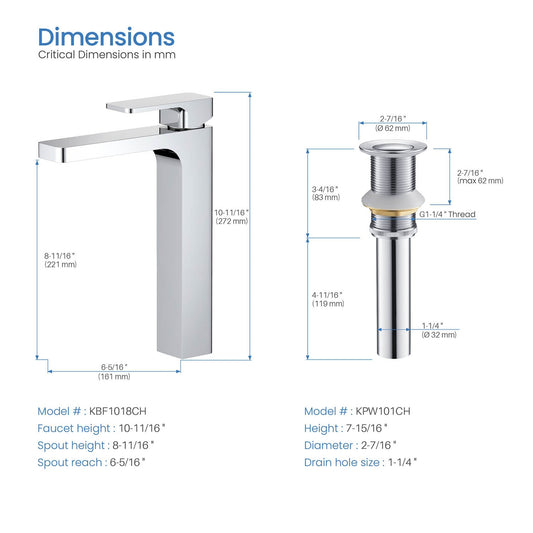 KIBI Blaze-T Single Handle Chrome Solid Brass Bathroom Vessel Sink Faucet With Pop-Up Drain Stopper Small Cover Without Overflow