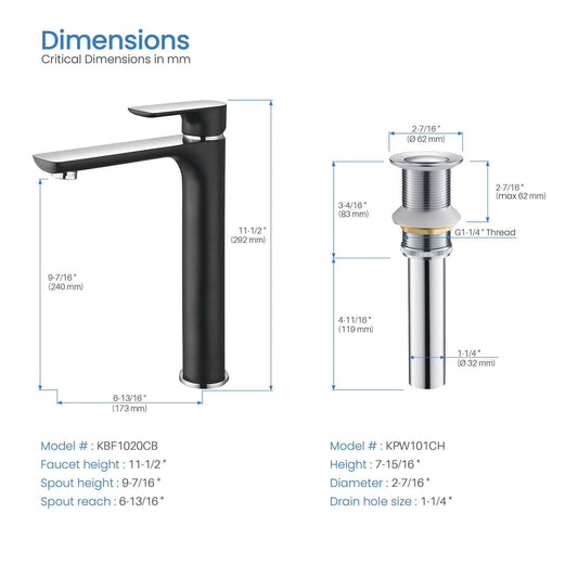 KIBI Tender-T Single Handle Black Solid Brass Bathroom Vessel Sink Faucet With Chrome Pop-Up Drain Stopper Small Cover Without Overflow