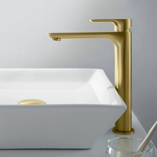 KIBI Tender-T Single Handle Brushed Gold Solid Brass Bathroom Vessel Sink Faucet With Pop-Up Drain Stopper Small Cover Without Overflow