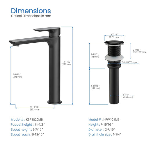 KIBI Blaze-T Single Handle Matte Black Solid Brass Bathroom Vessel Sink Faucet With Pop-Up Drain Stopper Small Cover Without Overflow