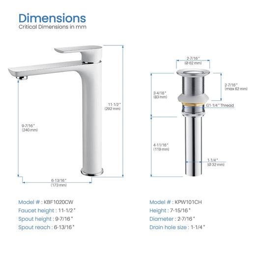 KIBI Tender-T Single Handle White Solid Brass Bathroom Vessel Sink Faucet With Chrome Pop-Up Drain Stopper Small Cover Without Overflow