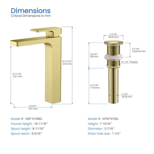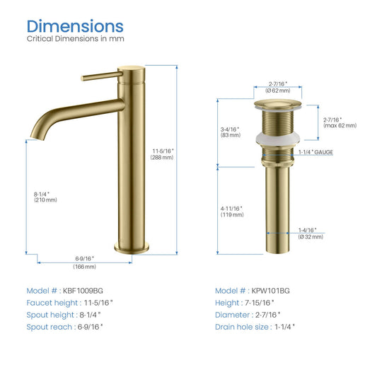 KIBI Blaze-T Single Handle Brushed Gold Solid Brass Bathroom Vessel Sink Faucet With Pop-Up Drain Stopper Small Cover Without Overflow