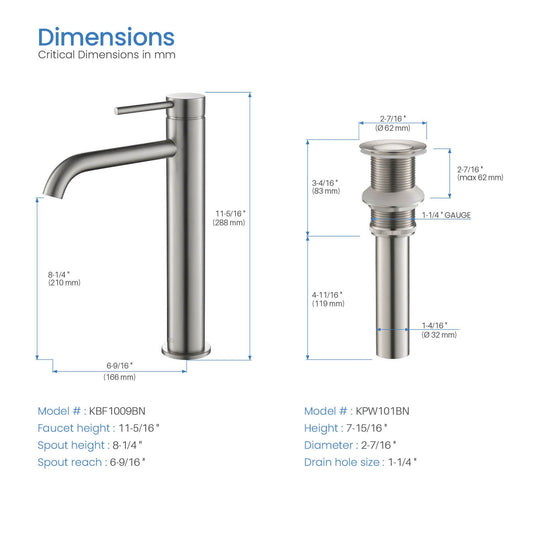 KIBI Waterfall Single Handle Brushed Nickel Solid Brass Bathroom Vanity Vessel Sink Faucet With Pop-Up Drain Stopper Small Cover Without Overflow