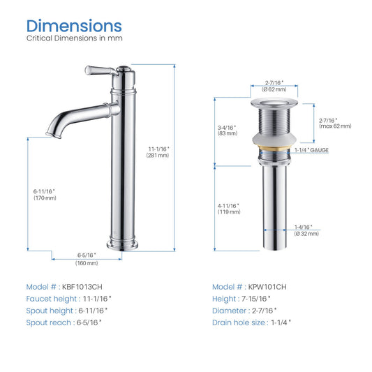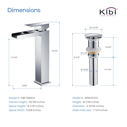 KIBI Waterfall Single Handle Chrome Solid Brass Bathroom Vanity Vessel Sink Faucet With Pop-Up Drain Stopper Small Cover Without Overflow