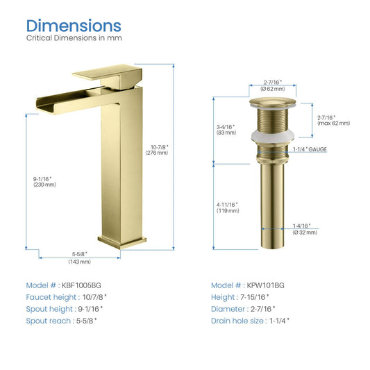 KIBI Waterfall Single Handle Brushed Gold Solid Brass Bathroom Vanity Vessel Sink Faucet With Pop-Up Drain Stopper Small Cover Without Overflow
