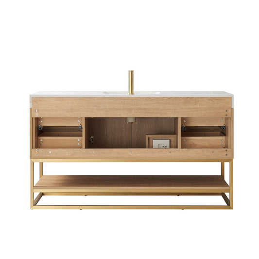 Vinnova Alistair 60" Single Sink Bath Vanity In North American Oak And Brushed Gold Finish With White Grain Stone Countertop