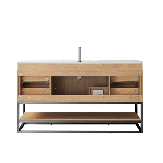 Vinnova Alistair 60" Single Sink Bath Vanity In North American Oak And Matte Black Finish With White Grain Stone Countertop
