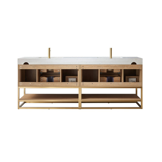 Vinnova Alistair 84" Double Sink Bath Vanity In North American Oak And Brushed Gold Finish With White Grain Stone Countertop