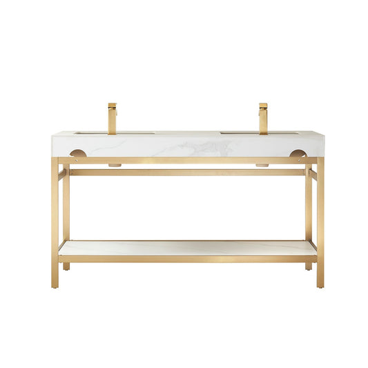 Vinnova Funes 60" Double Sink Bath Vanity In Brushed Gold Metal Support With White Sintered Stone Top