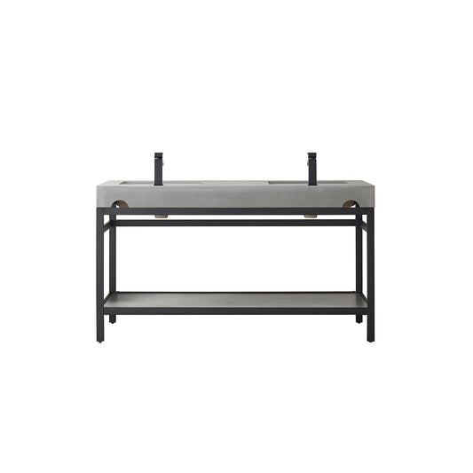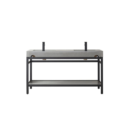 Vinnova Funes 60" Double Sink Bath Vanity In Matt Black Metal Support With Grey Sintered Stone Top