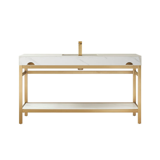 Vinnova Funes 60" Single Sink Bath Vanity In Brushed Gold Metal Support With White Sintered Stone Top
