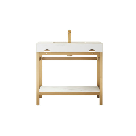Vinnova Funes 36" Single Sink Bath Vanity In Brushed Gold Metal Support With White Sintered Stone Top