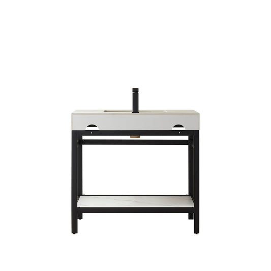 Vinnova Funes 36" Single Sink Bath Vanity In Matt Black Metal Support With White Sintered Stone Top