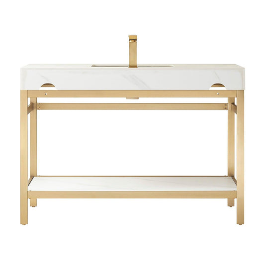 Vinnova Funes 48" Single Sink Bath Vanity In Brushed Gold Metal Support With White Sintered Stone Top And Mirror