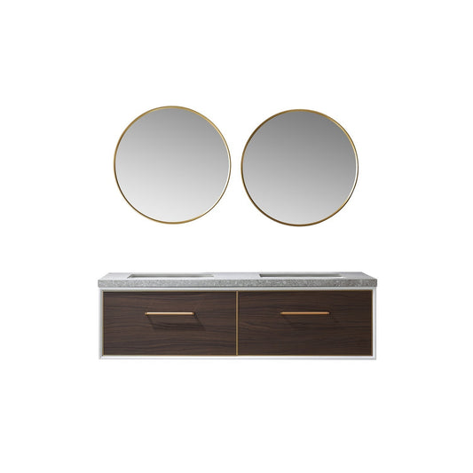 Vinnova Caparroso 60" Double Sink Floating Bathroom Vanity In Dark Walnut And Brushed Gold Hardware Finish With Grey Sintered Stone Top And Mirror
