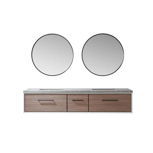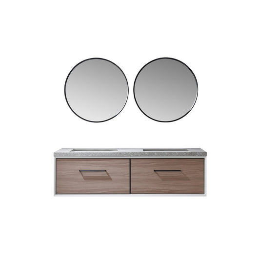 Vinnova Caparroso 60" Double Sink Floating Bathroom Vanity In Light Walnut And Matte Black Hardware Finish With Grey Sintered Stone Top And Mirror