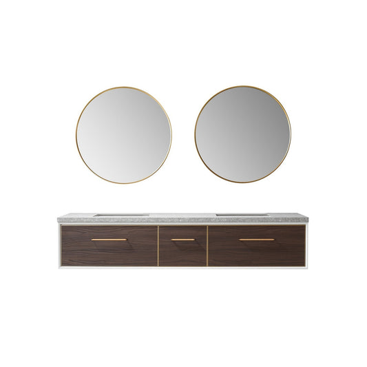 Vinnova Caparroso 72" Double Sink Floating Bathroom Vanity In Dark Walnut And Brushed Gold Hardware Finish With Grey Sintered Stone Top And Mirror
