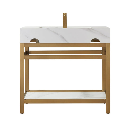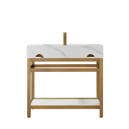 Vinnova Bilbao 36" Single Vanity With Brushed Gold Stainless Steel Bracket Match With Snow Mountain White Stone Countertop Without Mirror