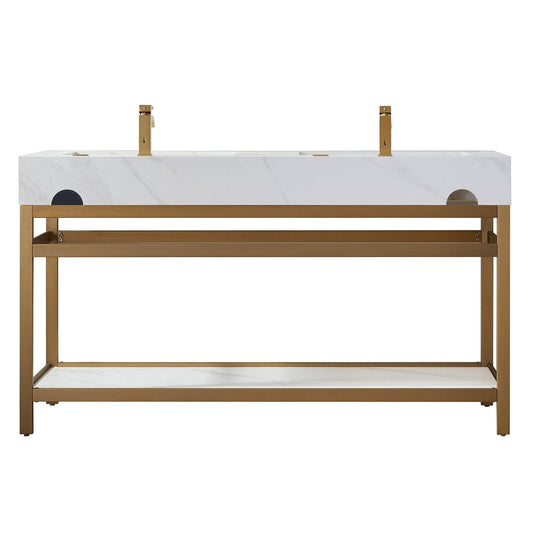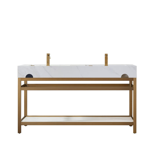 Vinnova Bilbao 60" Double Vanity With Brushed Gold Stainless Steel Bracket Match With Snow Mountain White Stone Countertop Without Mirror