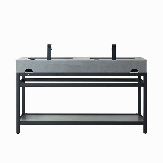 Vinnova Bilbao 60" Double Vanity With Matte Black Stainless Steel Bracket Match With Grey Sintered Stone Countertop Without Mirror