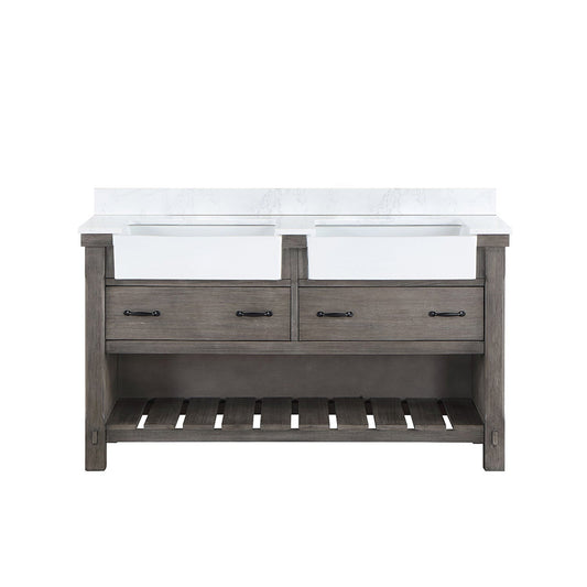 Vinnova Villareal 60" Double Bath Vanity In Weathered Pine With Composite Stone Top In White Finish And White Farmhouse Basin