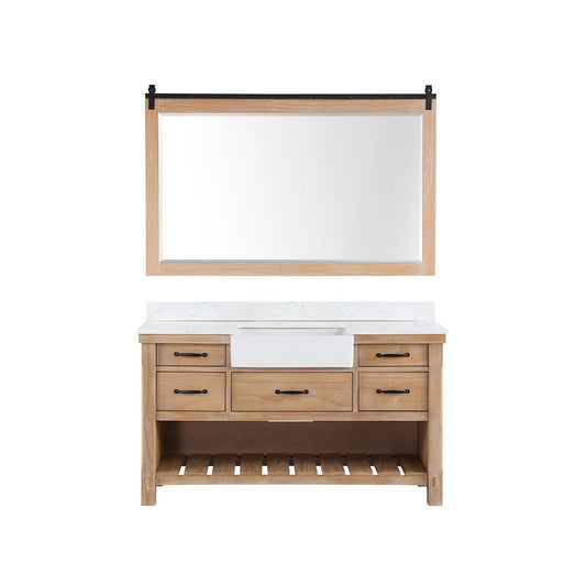 Vinnova Villareal 60" Single Bath Vanity In Weathered Pine With Composite Stone Top In White Finish And White Farmhouse Basin And Mirror