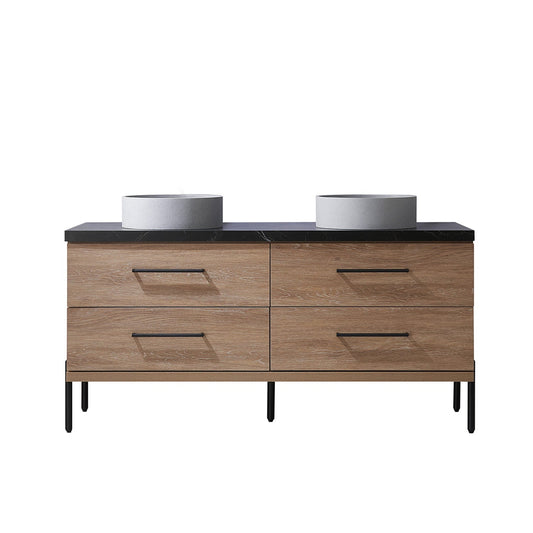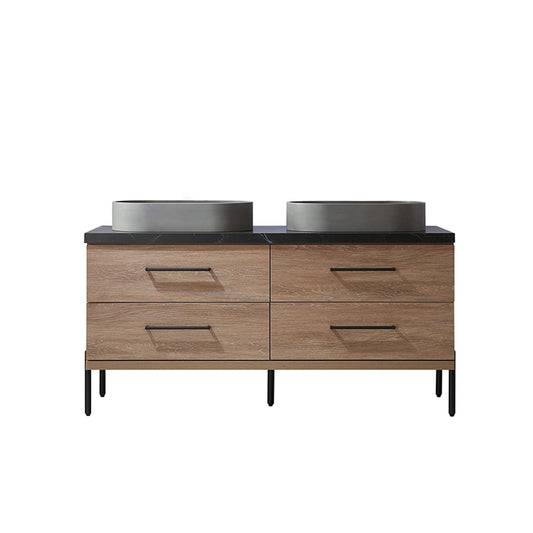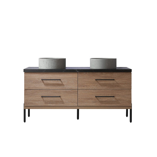 Vinnova Trento 60" Double Sink Bath Vanity In North American Oak With Black Sintered Stone Top With Circular Concrete Sink