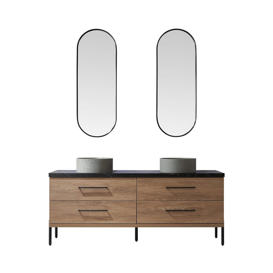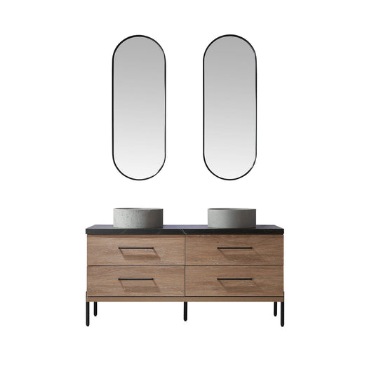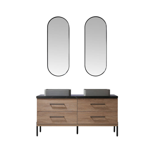 Vinnova Trento 60" Double Sink Bath Vanity In North American Oak With Black Sintered Stone Top With Oval Concrete Sink And Mirror