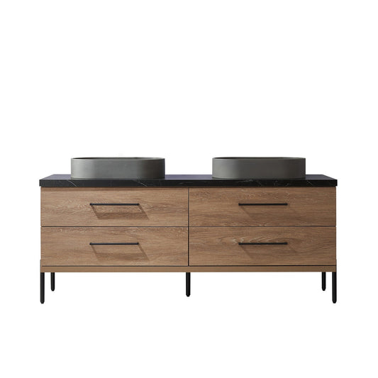 Vinnova Trento 72" Double Sink Bath Vanity In North American Oak With Black Sintered Stone Top With Circular Concrete Sink
