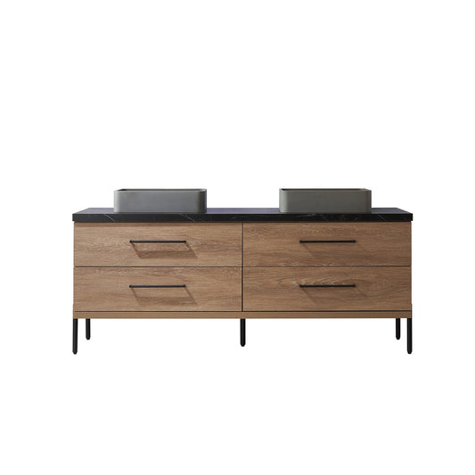 Vinnova Trento 72" Double Sink Bath Vanity In North American Oak With Black Sintered Stone Top With Rectangular Concrete Sink