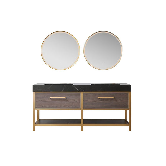 Vinnova Segovia 72" Double Sink Bath Vanity In Suleiman Oak Finish With Black Sintered Stone Top And Mirror