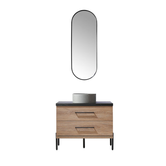 Vinnova Trento 36" Single Sink Bath Vanity In North American Oak With Black Sintered Stone Top With Oval Concrete Sink And Mirror