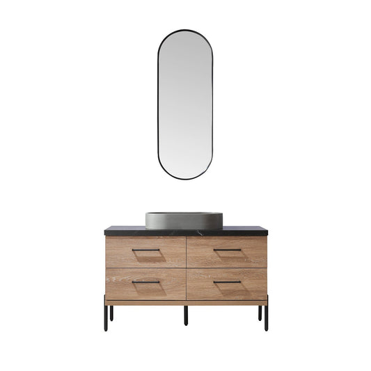 Vinnova Trento 48" Single Sink Bath Vanity In North American Oak With Black Sintered Stone Top With Oval Concrete Sink And Mirror