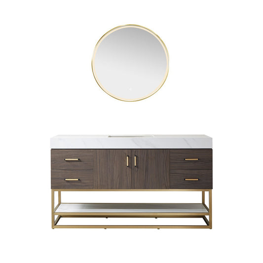 Vinnova Toledo 60" Single Sink Bath Vanity In Dark Walnut Finish With White Sintered Stone Top And Mirror