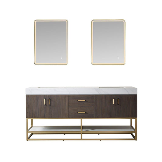 Vinnova Toledo 72" Double Sink Bath Vanity In Dark Walnut Finish With White Sintered Stone Top And Mirror