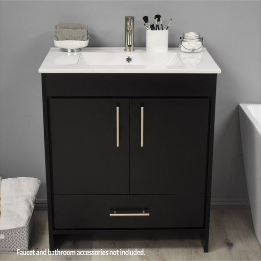 Volpa USA Pacific 30" Black Freestanding Modern Bathroom Vanity With Integrated Ceramic Top and Brushed Nickel Round Handles