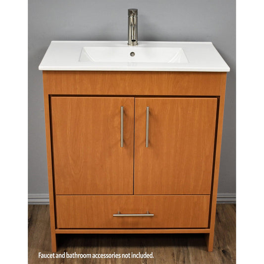 Volpa USA Pacific 30" Honey Maple Freestanding Modern Bathroom Vanity With Integrated Ceramic Top and Brushed Nickel Round Handles