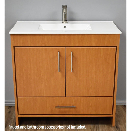 Volpa USA Pacific 36" Honey Maple Freestanding Modern Bathroom Vanity With Integrated Ceramic Top and Brushed Nickel Round Handles