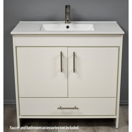 Volpa USA Pacific 36" Soft White Freestanding Modern Bathroom Vanity With Integrated Ceramic Top and Brushed Nickel Round Handles