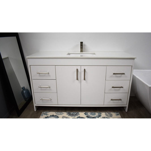 Volpa USA Capri 60" x 22" White Freestanding Modern Bathroom Vanity With Undermount Single Sink and White Microstone Top With Brushed Nickel Edge Handles