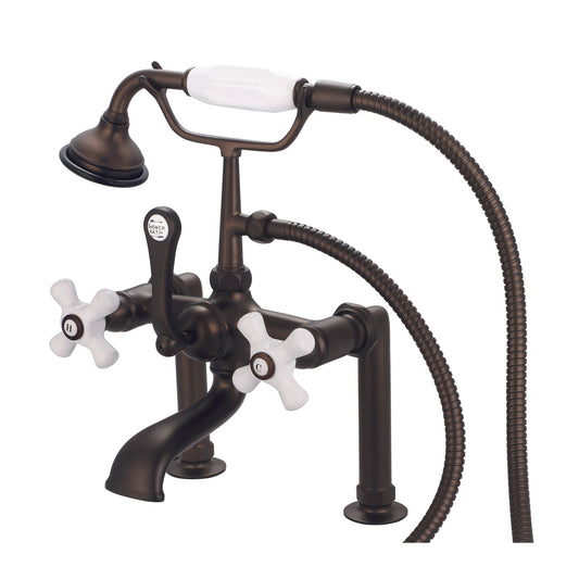 Water Creation Vintage Classic Spread Deck Mount Tub F6-0006 7" Brown Solid Brass Faucet With 6-Inch Risers And Handheld Shower And Porcelain Cross Handles, Hot And Cold Labels Included