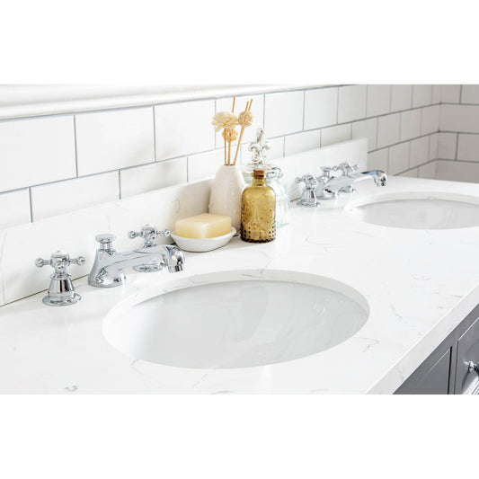 Water Creation Queen 60" Double Sink Quartz Carrara Vanity In Cashmere Grey With F2-0009-01-BX Lavatory Faucet(s)