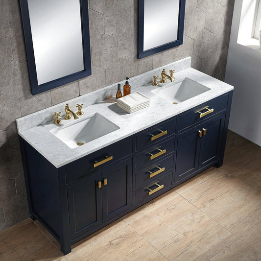 Water Creation Madison 72" Double Sink Carrara White Marble Vanity In Monarch Blue With Matching Mirror(s)