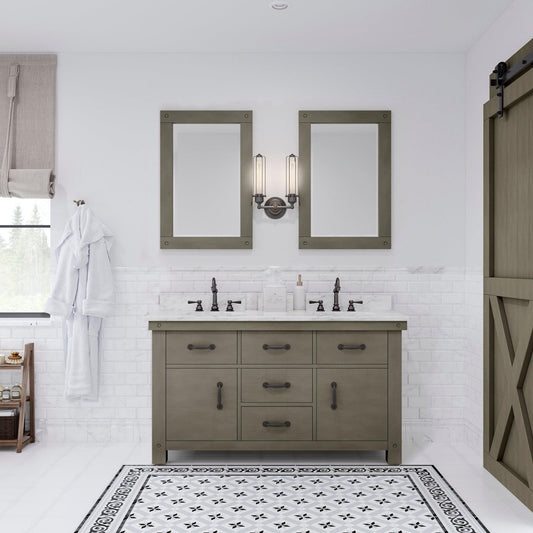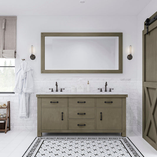 Water Creation Aberdeen 60" Grizzle Grey Double Sink Bathroom Vanity With Mirror And Faucets With Carrara White Marble Counter Top