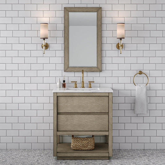 Water Creation Oakman 30" Single Sink Carrara White Marble Countertop Bath Vanity in Grey Oak with Gold Faucets and Rectangular Mirrors