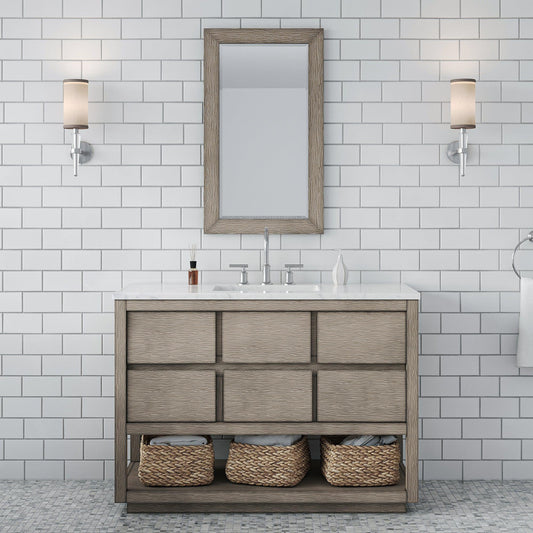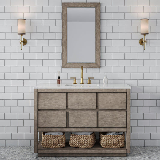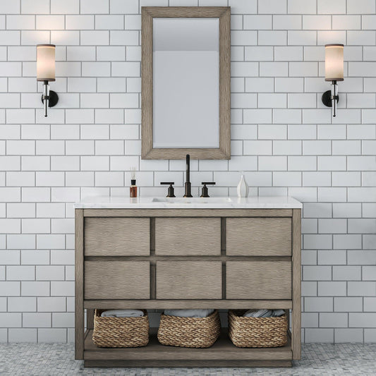 Water Creation Oakman 48" Single Sink Carrara White Marble Countertop Bath Vanity in Grey Oak with Rectangular Mirror