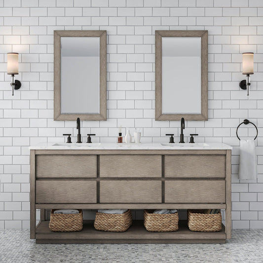 Water Creation Oakman 72" Double Sink Carrara White Marble Countertop Bath Vanity in Grey Oak with ORB Faucets and Rectangular Mirrors