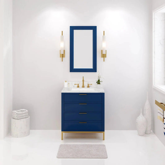 Bristol 30 In. Single Sink Carrara White Marble Countertop Bath Vanity in Monarch Blue with Rectangular Mirror (S)