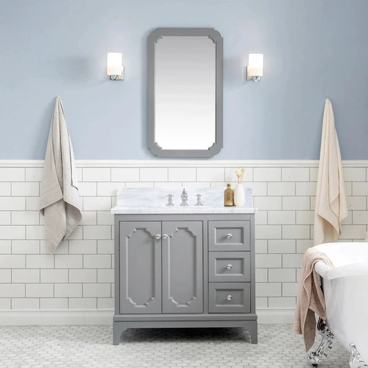 Water Creation Queen 36" Single Sink Carrara White Marble Countertop Vanity in Cashmere Grey with Classic Faucet and Mirror